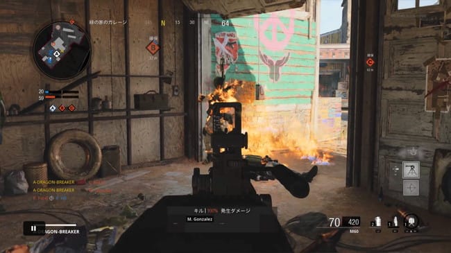 フラックジャケットをつけていない敵の場合、直撃させ約0.63秒ほど炎に巻き込めばキルできる。