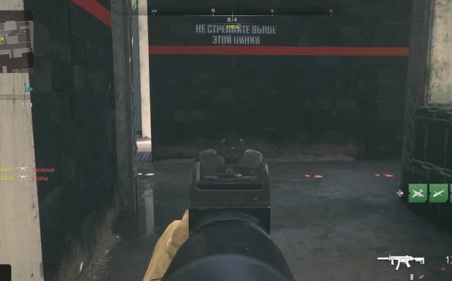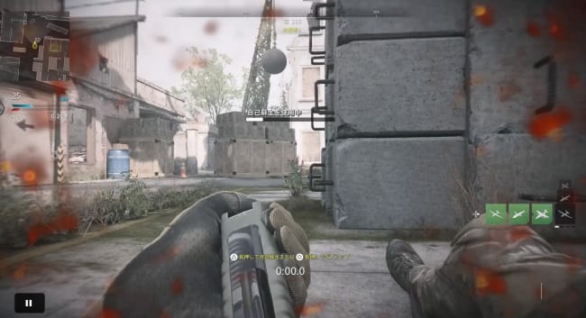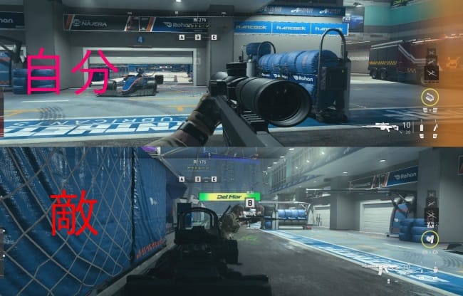 「敵に見られている」という判定は緩く、照準が合ってなくても、以下のようにある程度近ければ瞬時に黄色の光が出る(エイムでも腰撃ちでも)。