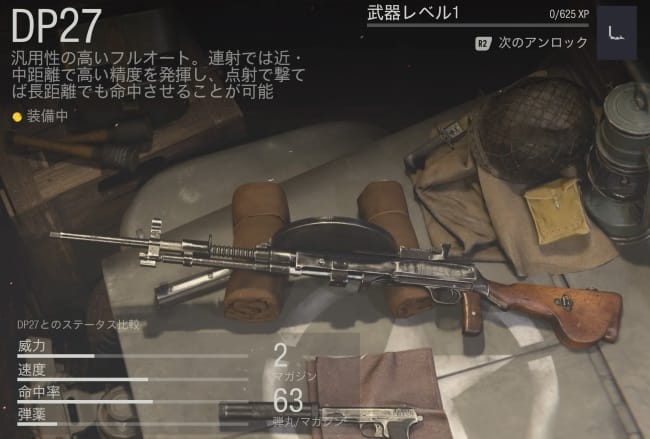 DP27はダメージ増加マガジンをつけることで、高火力を出せ、キルタイムはMG42をわずかに上回る。ただエイム速度が特に遅いのがマイナス点。反動方向変化も厄介。これらの弱点を立ち回りと技量で補えるかどうかが重要な武器だ。
